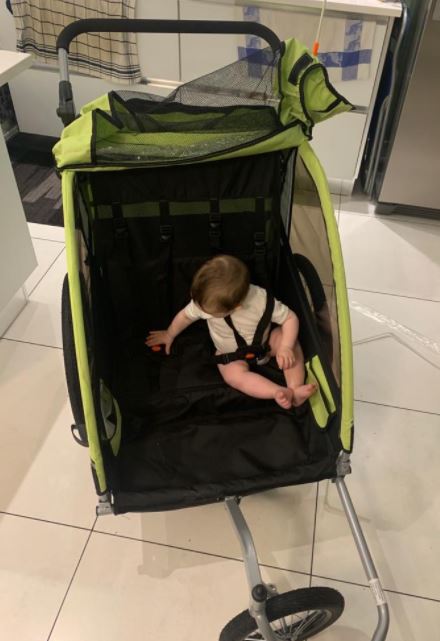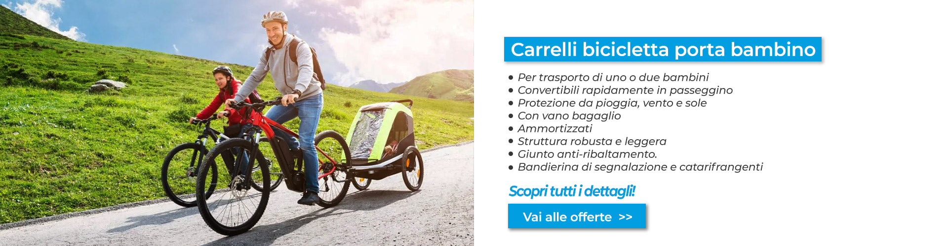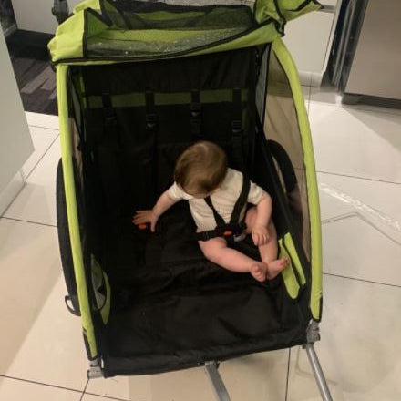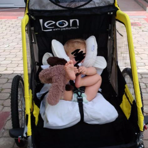 Carrello per traino bambino.Personalmente sono rimasto soddisfatto del prodotto. Io ho portato il nostro bimbo gia a 6 mesi di vita, semplicemente inserendo l ovetto all' interno del carrellino(legando l' ovetto al interno). Il risultato è stato di aver un bimbo super protetto e super comodo, per la gioia dei genitori, ad un prezzo economico. Prodotto come si vede ripiegabile in 5 minuti, ruote con sgancio rapido.IL carrello è ammortizzato e molto capiente. Posso solo dire cose positive sul prodotto, l' unica casa non eccellente è il freno di stazionamento che non trovo efficace. SPEDIZIONE: Veloce e nei tempi previsti. VENDITORE: CONSIGLIATO