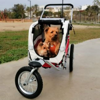 Buena calidad y acabado. Mis perros de 10 y 4 kilos van perfectamente. No me ha gustado que la medida del remolque con el manillar mide más de 120 centímetros, las medidas que figuran en la foto del anuncio inducen a error ya que parece indicar que mide 120 centímetros total junto con el manillar. Le doy 3 estrellas porque tal y como se aprecia en el vídeo, en la parte donde se introduce la rueda delantera tiene óxido, por lo demás cumple con las espectativas.