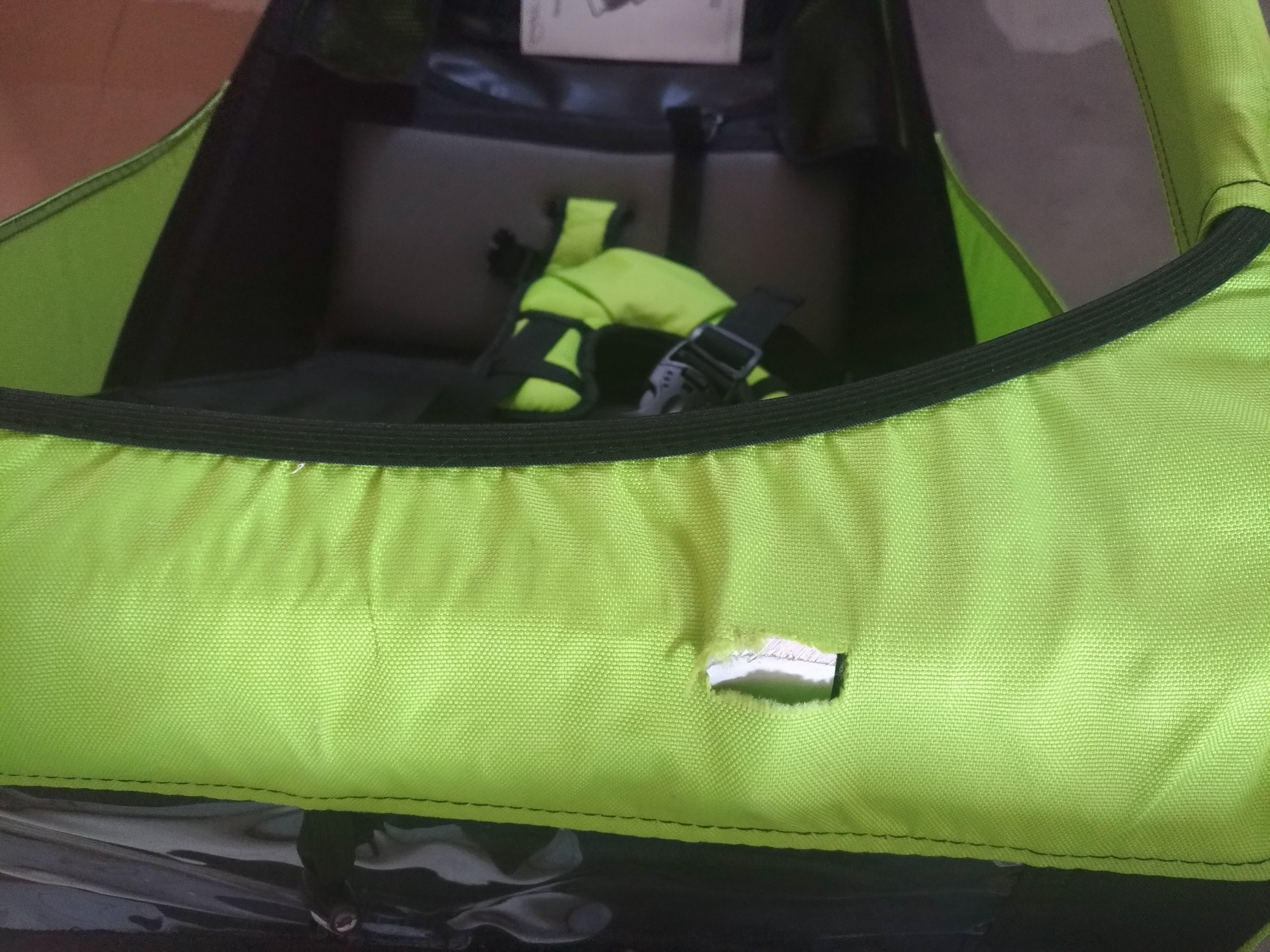 Rimorchio nuovo, presenta una lacerazione al tessuto di circa 2 cm nella parte superiore (vedi foto). Questo problema non pregiudica la robustezza e sicurezza del rimorchio.