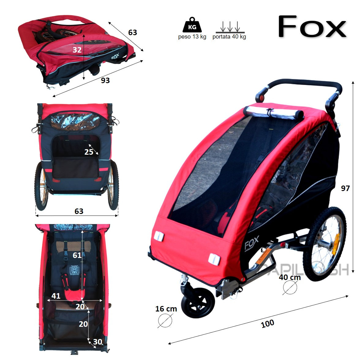 Rimorchio Bicicletta e Passeggino Per 1 Bambino modello FOX VERDE (Cod. DIF2605).