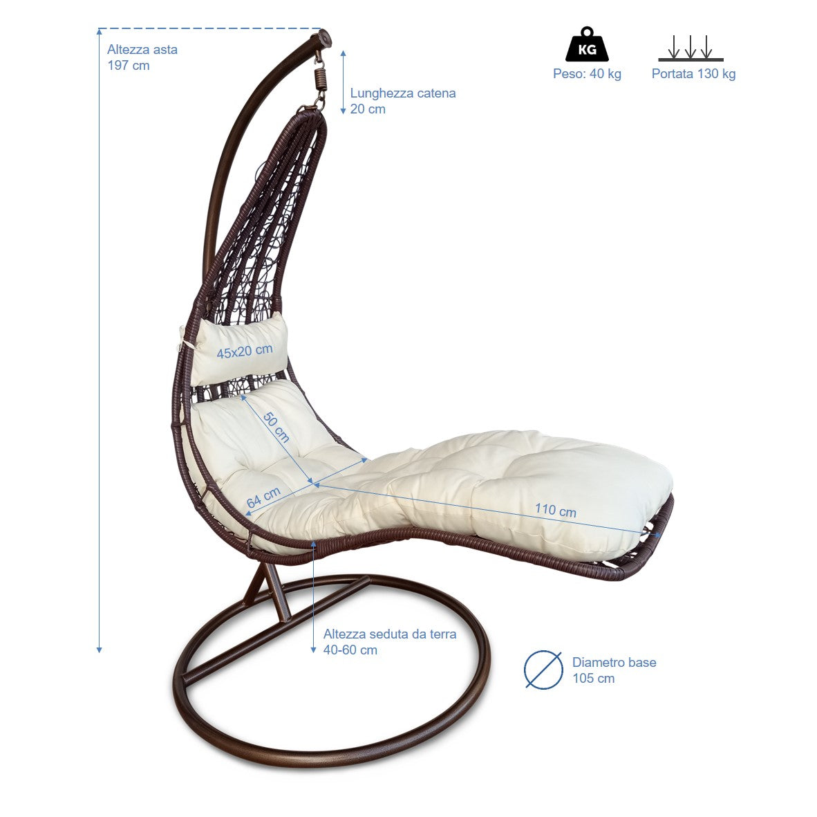 La sdraio appesa da giardino KOBRA è composta da una struttura in acciaio, con base di diametro 105 cm e 197 cm di altezza, dalla poltrona in rattan e da morbidi cuscini in poliestere. Viene spedita non montata, pertanto è da assemblare, ma il procedimento è molto semplice e veloce.